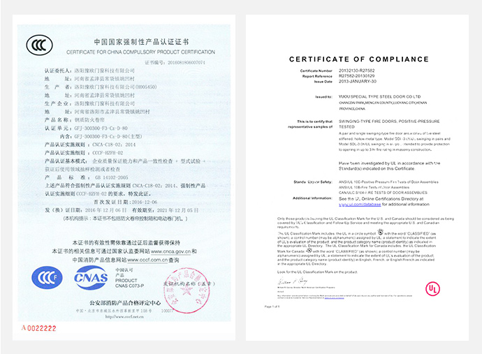 鋼質(zhì)防火門(mén)是指用冷軋薄鋼板作門(mén)框、骨架、門(mén)板,在門(mén)扇內(nèi)填充不燃隔熱材料,根據(jù)需要可以在門(mén)扇上安裝復(fù)合防火玻璃及門(mén)扇上方設(shè)有A類復(fù)合防火玻璃亮窗,并配以防火五金配件所組成的能滿足耐火完整性和隔熱性要求的門(mén)。鋼質(zhì)防火門(mén)按耐火極限可分為甲 級(jí)、乙級(jí)、丙級(jí)三類防火門(mén),其耐火極限要求分別為72min、54min和36min。鋼質(zhì)防火門(mén)應(yīng)采用冷軋薄鋼板制作門(mén)框、門(mén)扇面板及加固件。門(mén)框與門(mén)扇鋼板厚度分別為1.2mm~1.5mm和0.8mm~1.2mm。加固件鋼板厚度為1.2mm~1.5mm,如設(shè)有螺孔則不低于3mm。用于鋼質(zhì)防火門(mén)的五金配件需要是耐火五金配件,主要五金配件為:防火合頁(yè)(鉸鏈)、防火插銷、防火門(mén)鎖、防火順序器和防火閉門(mén)器等。